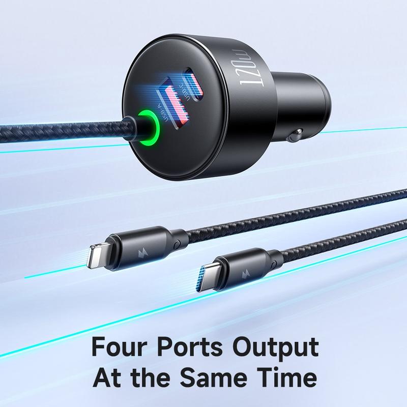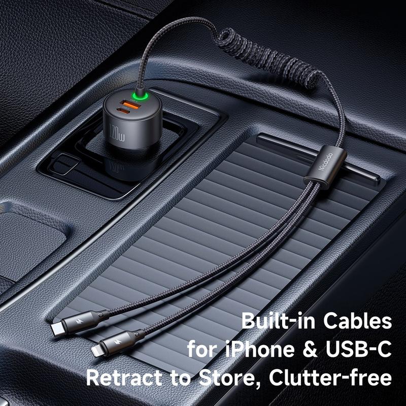 - Hurtigoplad en USB-C-laptop på lange motorvejsstrækninger, mens din passager oplader en iPhone fra den indbyggede Lightning-ledning.