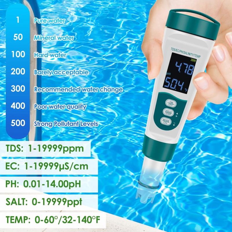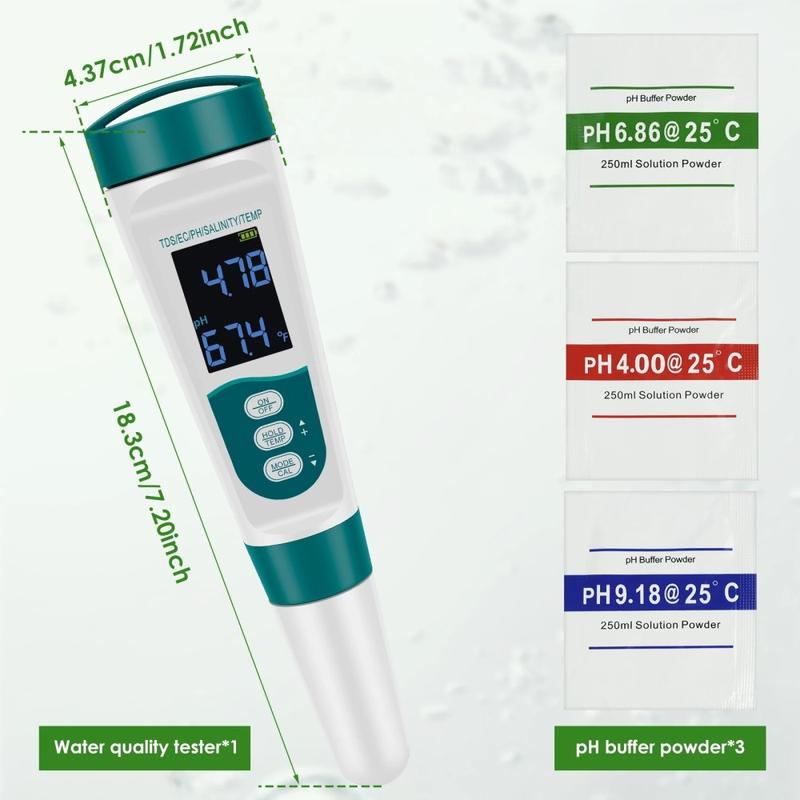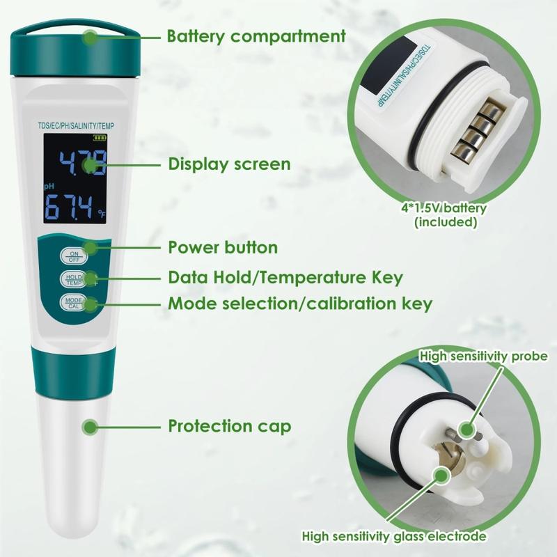 - 4-i-1-måling - kontrollerer pH 0,00-14,00 (±0,05 pH), TDS 0-9999 ppm (±2 %), EC 0-9999 µS/cm (±2 %) og saltholdighed 0-10 %.