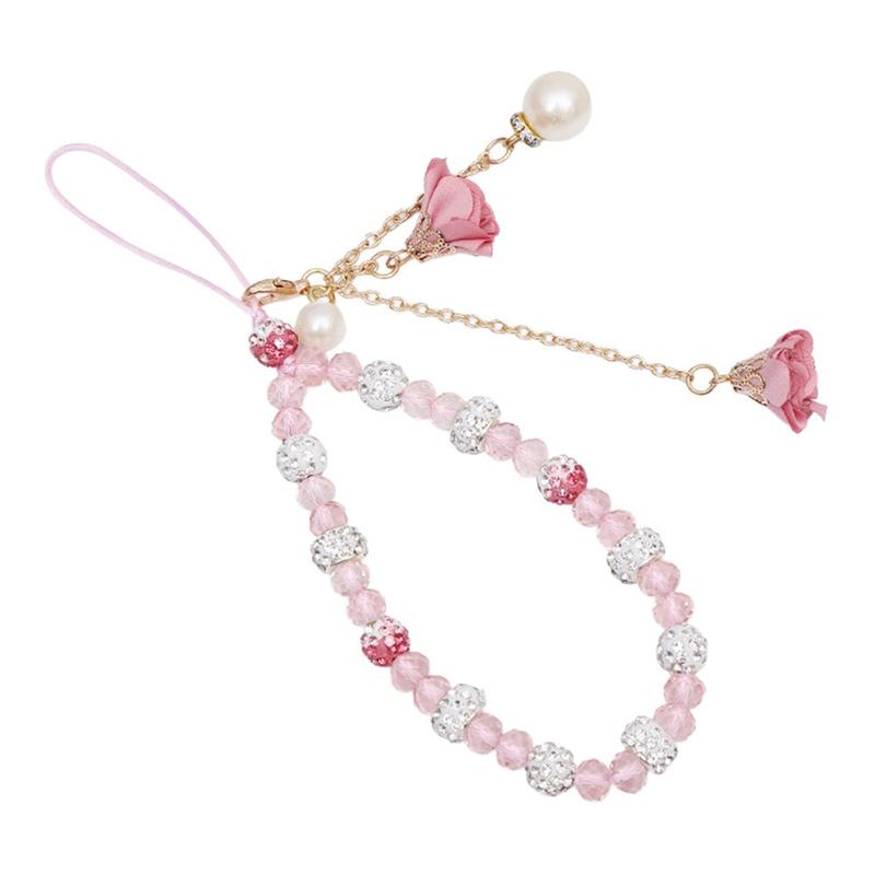 Mobilrem med rosenblomstvedhæng og krystalperler - lyserød