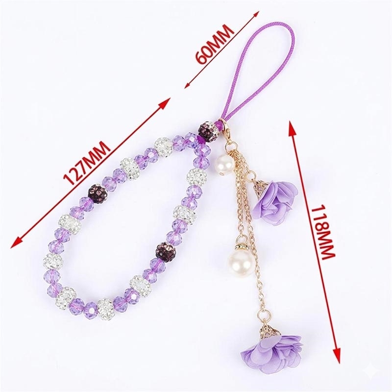 18,7 cm lang telefonrem med krystalperler og rosenvedhæng - håndledsrem og håndkæde til mobiltelefon
