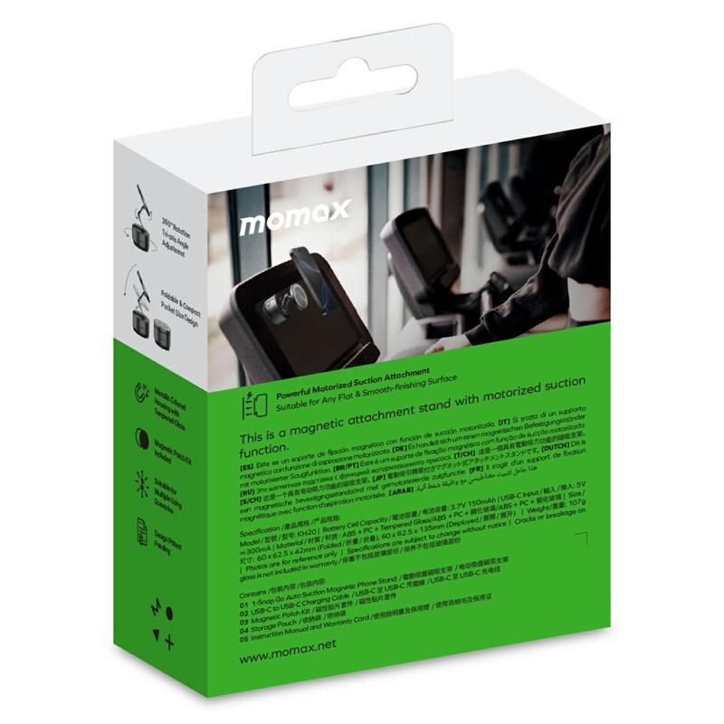 Momax KH20 1-Snap Go elektrisk magnetisk telefonholder - motoriseret automatisk sugekop, treakset foldbar holder med 360° rotation, USB-C-genopladelig