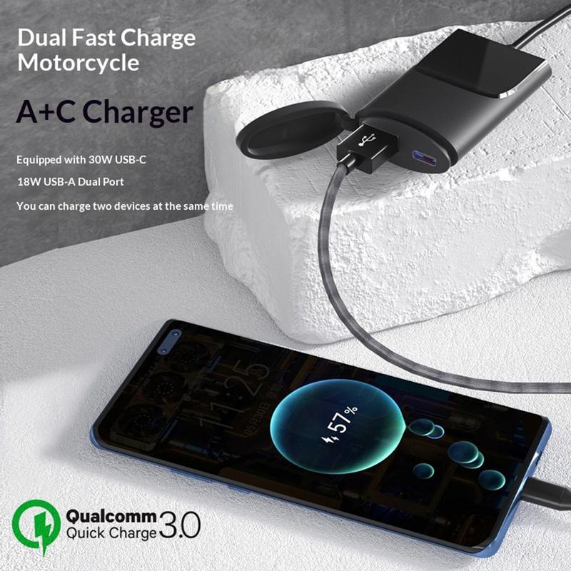 Med en 30W USB-C PD-port og en 18W USB-A-port understøtter denne oplader hurtigopladning til en lang række enheder og giver dig mulighed for at oplade to enheder på samme tid. Den vandtætte IP67-konstruktion og indbyggede sikkerhedsbeskyttelse gør den til et pålideligt valg til daglig kørsel og udendørs brug under skiftende vejrforhold.