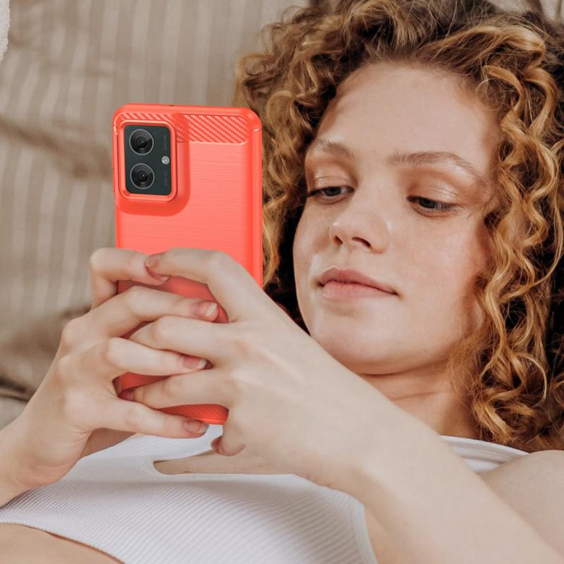 Det børstede TPU-cover beskytter din Motorola Moto G55 tilstrækkeligt, mens det giver den en fantastisk stil, takket være dets kulfibermønster på bagsiden. Coveret sikrer også mod overophedning, når du bruger din Motorola Moto G55, med dets varmeafledningsdesign.