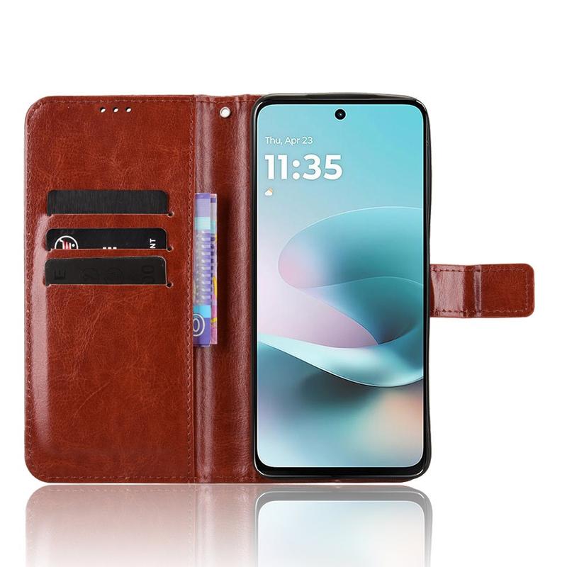Giv din nye Motorola Moto G67 Power, Moto G57 Power, Moto G57 et raffineret vintage-look, mens du erstatter din daglige pung. Ydersiden i polyuretan med Crazy Horse-tekstur kombineres med en stødabsorberende TPU-skal for at beskytte mod fald og ridser, mens smarte lommer holder styr på kort og kontanter.