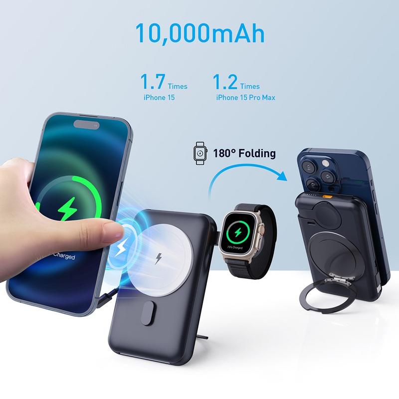 MP07 10000mAh-powerbanken er en smart alt-i-én opladningsløsning, der er udviklet til brugere, der ønsker mere bekvemmelighed, færre ledninger og større fleksibilitet i hverdagen. Med en kombination af magnetisk trådløs opladning, et indbygget kabel, understøttelse af opladning af Apple Watch og et sammenklappeligt, drejeligt stativ tilbyder den en mere elegant måde at holde dine vigtige enheder opladet hele dagen. Uanset om du pendler, rejser, arbejder eller blot bevæger dig mellem rum, hjælper denne kompakte oplader med at holde dit setup mere ryddeligt og praktisk.