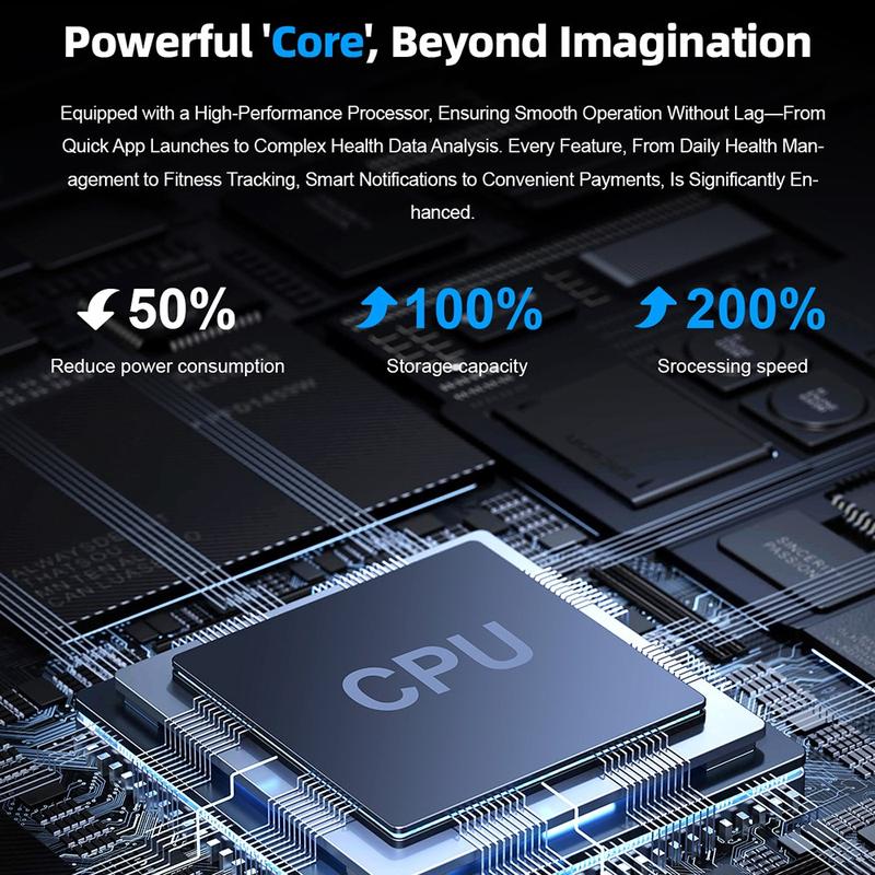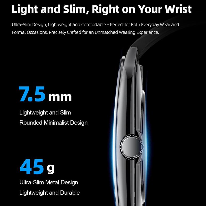 MT61 blander en fjerlet 0,045 kg zinklegeringsramme med en levende 1,96 tommer buet AMOLED-skærm og holder dig informeret, sund og forbundet uden at tynge dit håndled. Dens profil på syv millimeter glider let ind under skjortemanchetterne, mens Bluetooth 5.4 stemmeopkald, sundhedssporing hele dagen og 3D-urskiver, der kan tilpasses, forvandler hvert blik til brugbar indsigt.