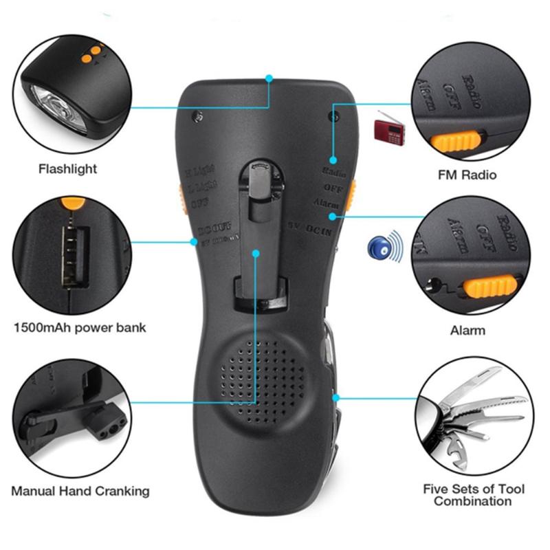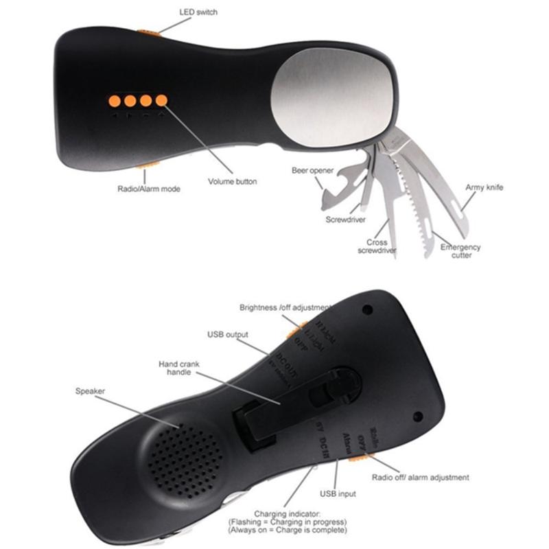 Multifunktionel lommelygte med håndsving og FM-radio, powerbank, nødværktøjssæt i 5 dele