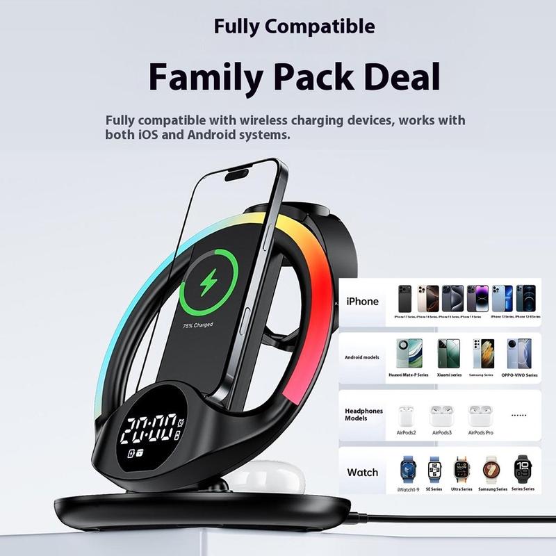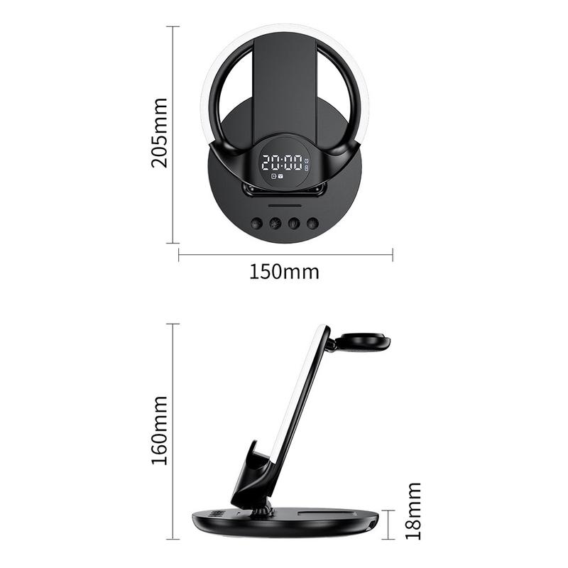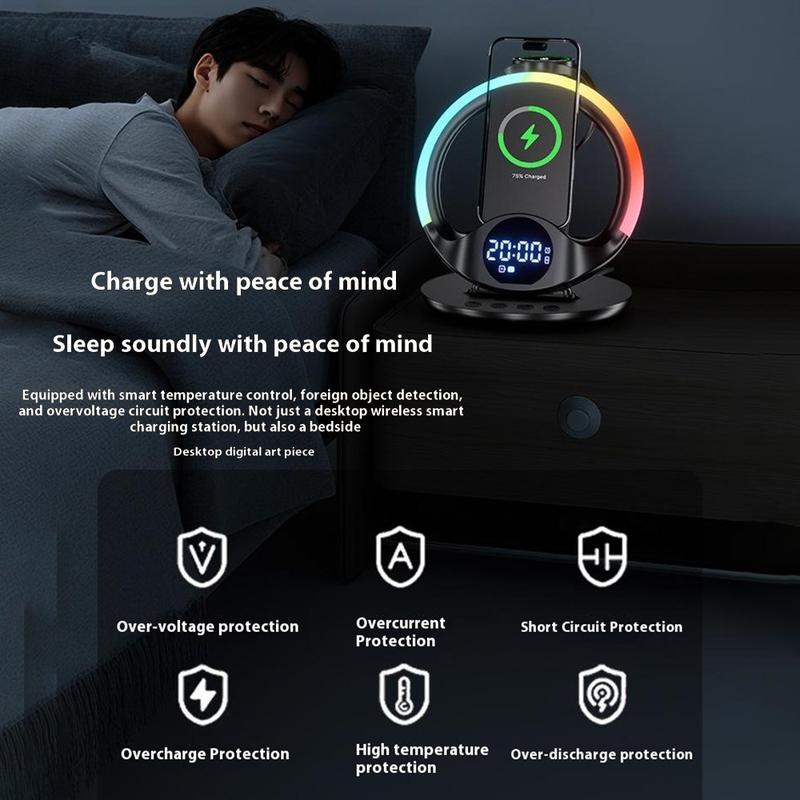 Mere end bare en oplader - den fungerer også som et digitalt ur og en telefonstander. Vælg mellem fem omgivende LED-baggrundsbelysningstilstande (hvid, pink hvid, rød, isblå, fantasifarve) for at matche dit humør eller din indretning.