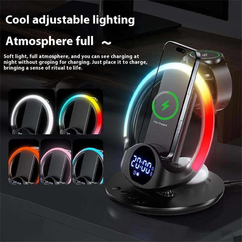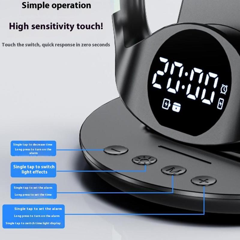 N01 6-i-1 trådløs opladningsstation / magnetisk hurtigopladningsstander med vækkeur, smart temperaturkontrol og natlys