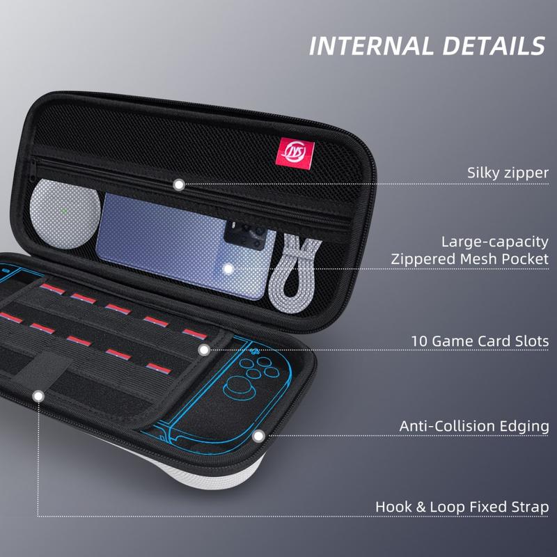 Bløde poser kan knuse og blande tilbehør med skærmen. JYS' design med to rum løser begge problemer: Et stift EVA-eksteriør modstår tryk, mens separate sektioner forhindrer kabler eller adaptere i at gnide mod konsollen. Ti kortlommer betyder, at du kan tage dine bedste titler med dig - ingen ekstra tasker er nødvendige.