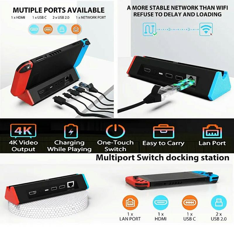 Opgrader dit gaming-setup med Nintendo Switch 2 Docking Station, der er designet til fantastiske billeder og alsidige tilslutningsmuligheder. Denne dockingstation understøtter op til 4K ved 120Hz output og sikrer jævn, high-definition gameplay på kompatible skærme. Med indbygget HDMI 2.1, USB 3.0, Type-C og RJ45-porte giver den en komplet hub-løsning til spil, streaming og hurtige onlineforbindelser. Det kompakte og bærbare design gør den perfekt til både hjemmeopsætninger og rejser og leverer den ultimative blanding af ydeevne og bekvemmelighed.