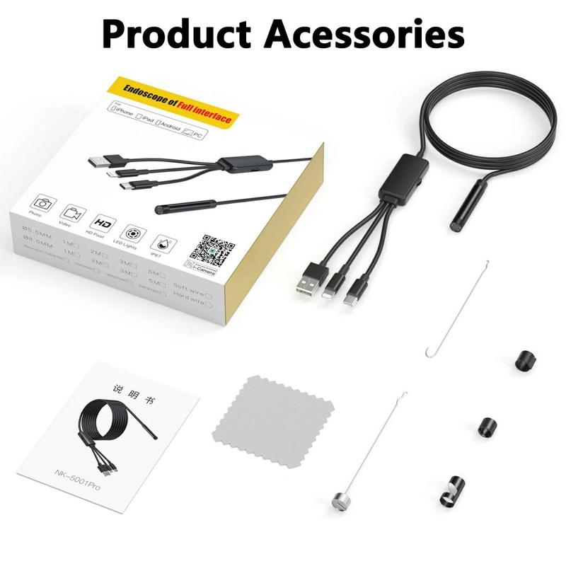 NK-5001Pro 3-i-1 vandtæt IP67-inspektionskamera/endoskop til iPhone/Smartphone, iPad/Tablet - Lightning, USB-C, USB - 5m, 1080p/720p