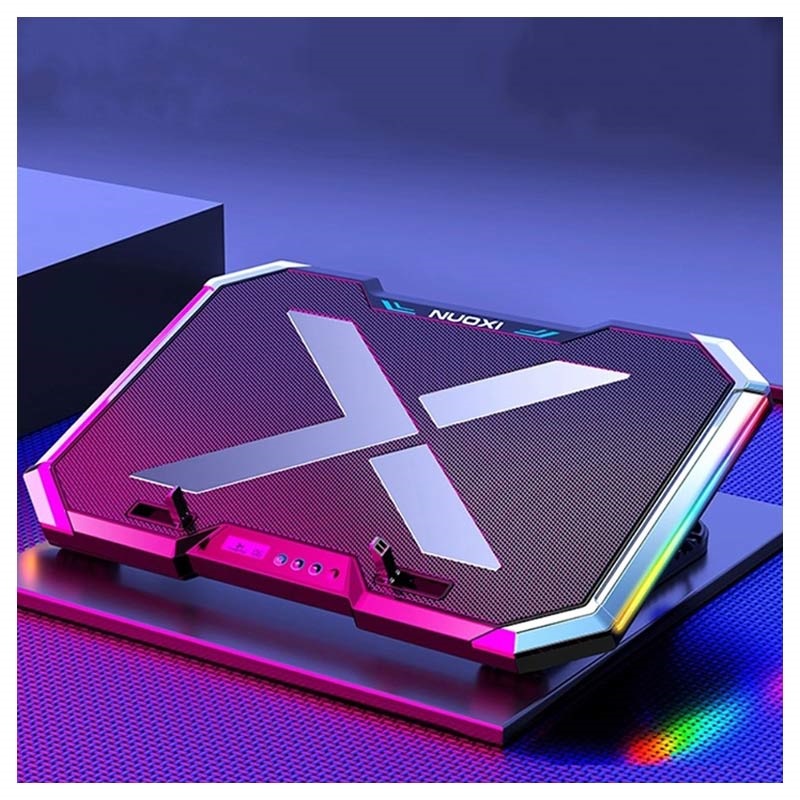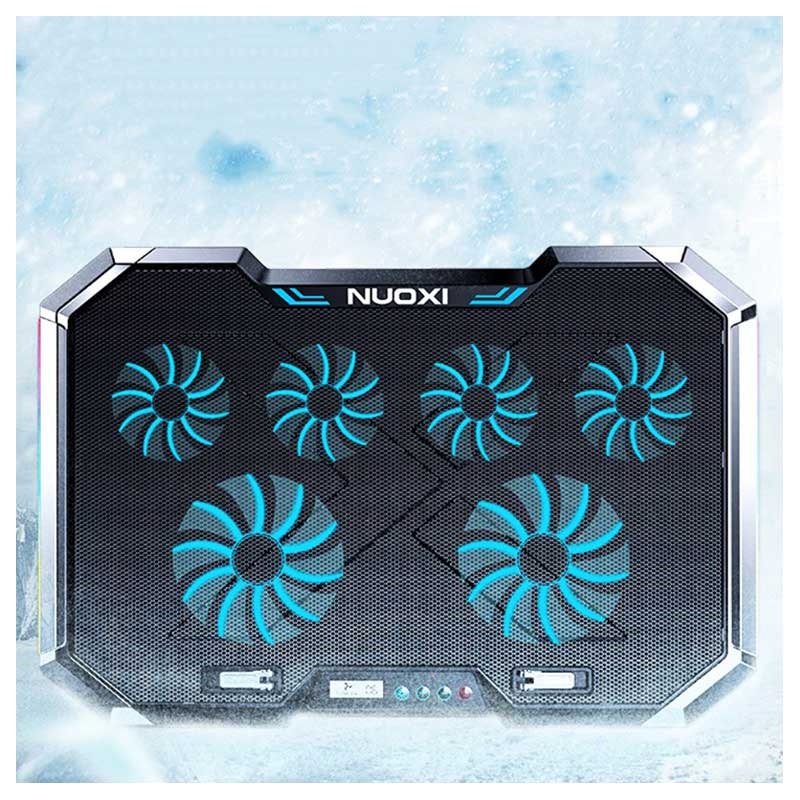 Nuoxi Q8 RGB er en køleplade der hjælper din computer med at undgå overophedning. Den er udstyret med to store og fire små blæsere, hvilket sikrer din bærbare computer masser af ventilation og luftstrøm. Du kan også give din computer et cool look med RGB-lyseffekten på pladens base. Den har også kontrolknapper og et display på forsiden, så du kan justere blæsernes hastighed og lyseffekten. De to praktiske stop-elementer lige ovenover displayet sikrer, at din computer ikke glider ned.