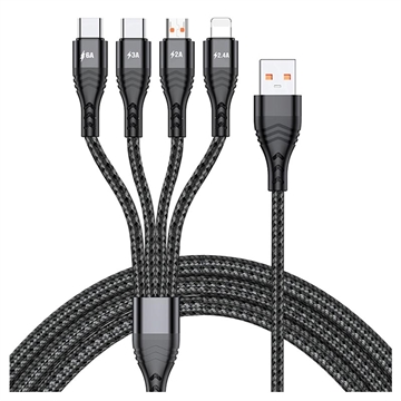 Dette 2m 4-i-1 66W 6A hurtigopladningskabel er den ultimative løsning til alle dine opladningsbehov. Med fire forskellige stiktyper, herunder USB til Pin, Micro USB og Dual Type-C, kan du nemt oplade flere enheder samtidigt. Det flettede design sikrer holdbarhed og lang levetid, mens den sorte farve giver et stilfuldt og moderne udseende.