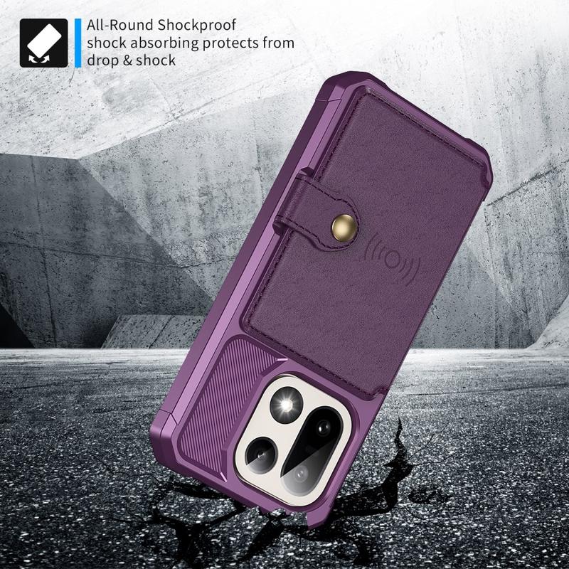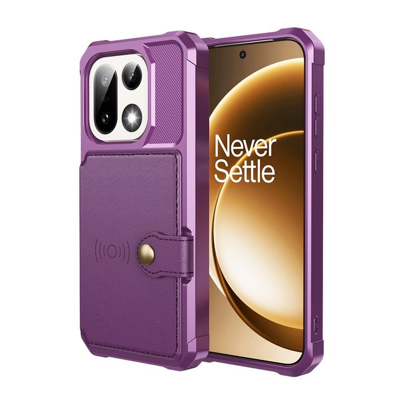- OnePlus 15 cover med kortholder har en sikkerheds lukkeknap, pung-design og adskillige kortlommer med en speciel lomme til kontanter
