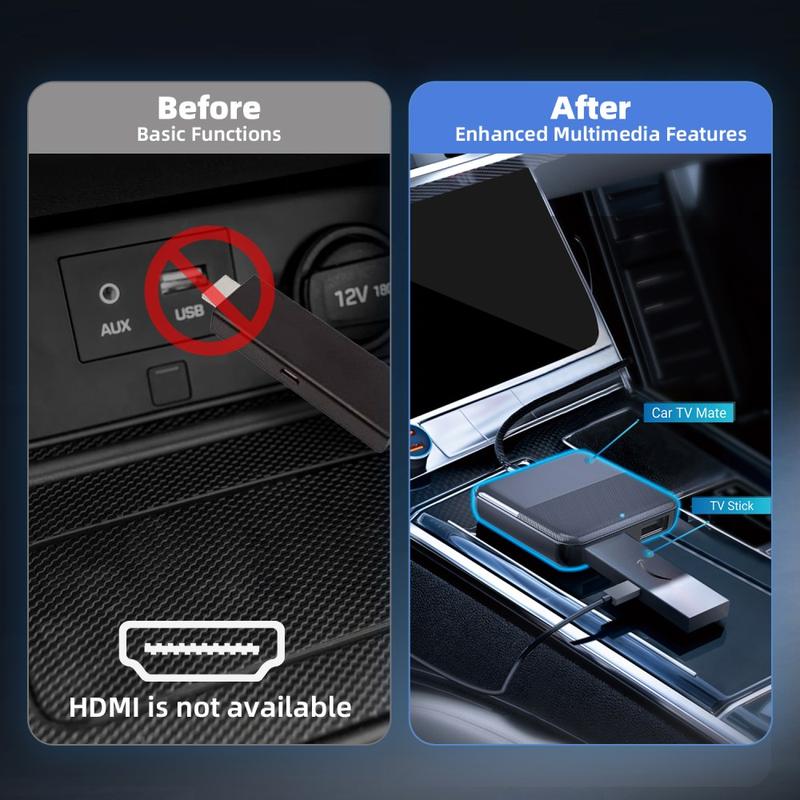 - Funktion: Konverterer bilens originale kabelforbundne CarPlay til HD-indgang for at bruge Amazon Fire TV-klistermærker, til Apple TV, Digital TV, Blu-ray DVD, til XBox, til PS5, til Nintendo og andet spilkonsoludstyr i bilen.