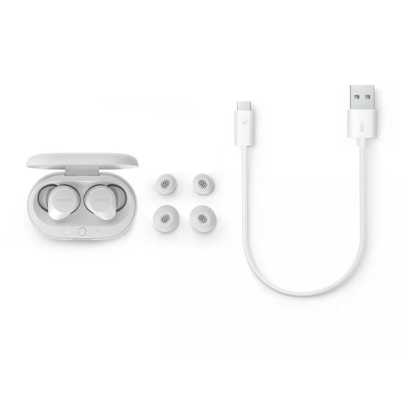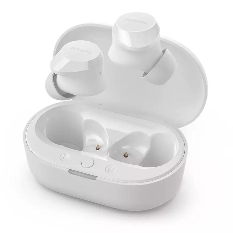 Oplev glæden ved ubesværet lytning med Philips True Wireless Headphones. Disse kompakte, men kraftfulde øretelefoner har en dynamisk bas, der vækker dine yndlingsnumre til live - selv ved lavere lydstyrke. Takket være en dedikeret mikrofon med støjreducerende teknologi lyder dine opkald klart og uforstyrret. De er designet til komfort og bekvemmelighed og har et opladningsetui i lommeformat, robust Bluetooth-forbindelse og en IPX4-stænkafvisende konstruktion, der er klar til alt, hvad dagen byder på.