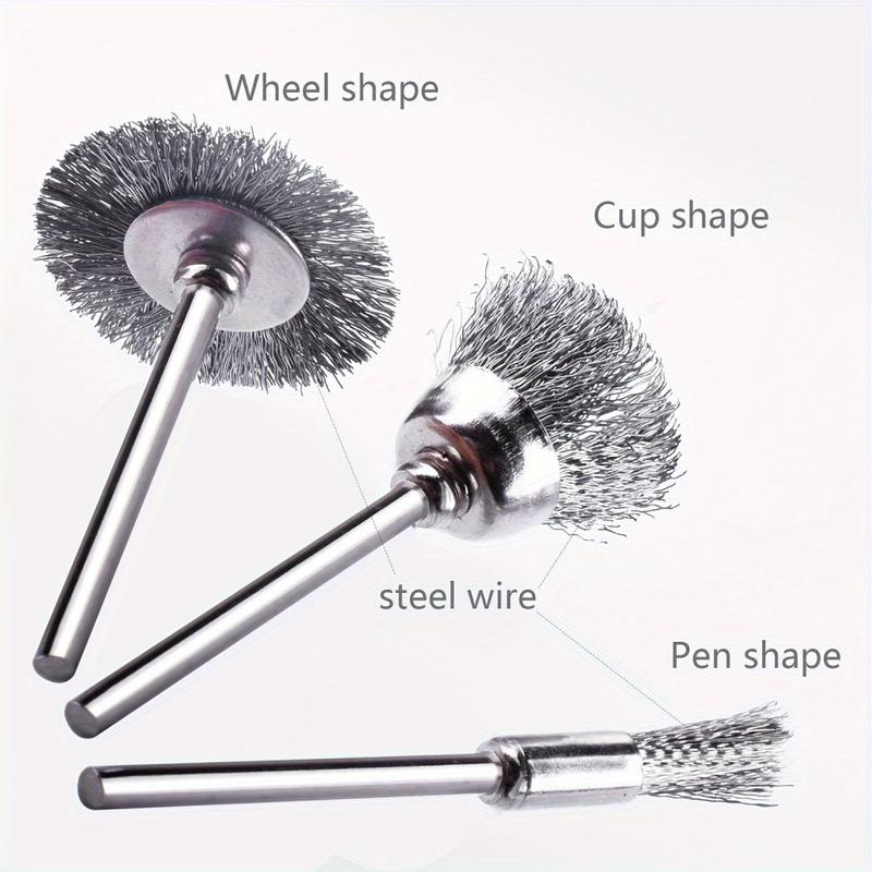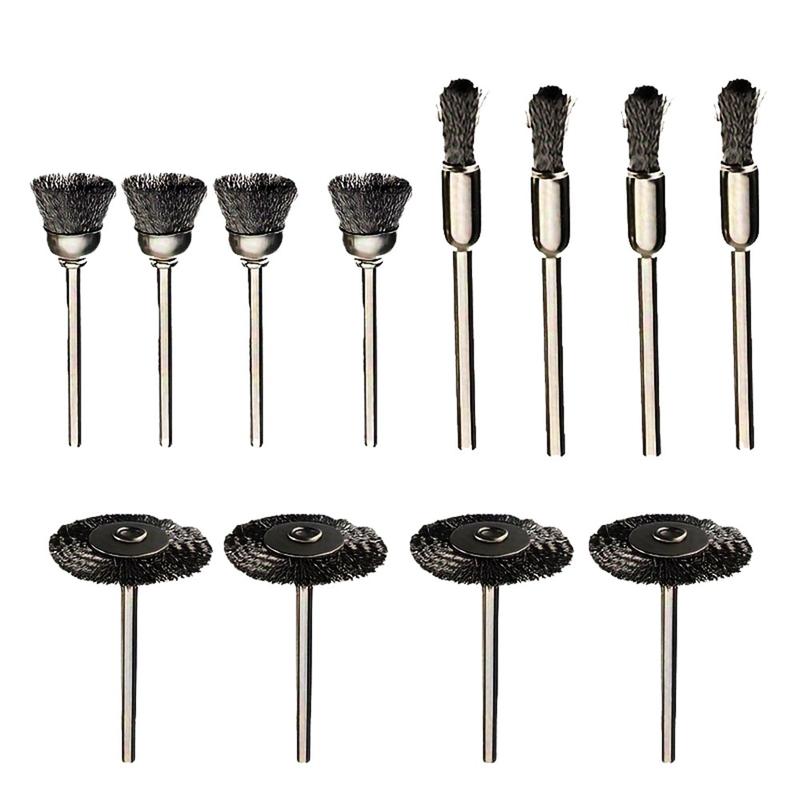 12 stk. Ståltrådbørstesæt med 3mm skaft - pen-, skål- og T-form til fjernelse af rust og polering af roterende værktøj