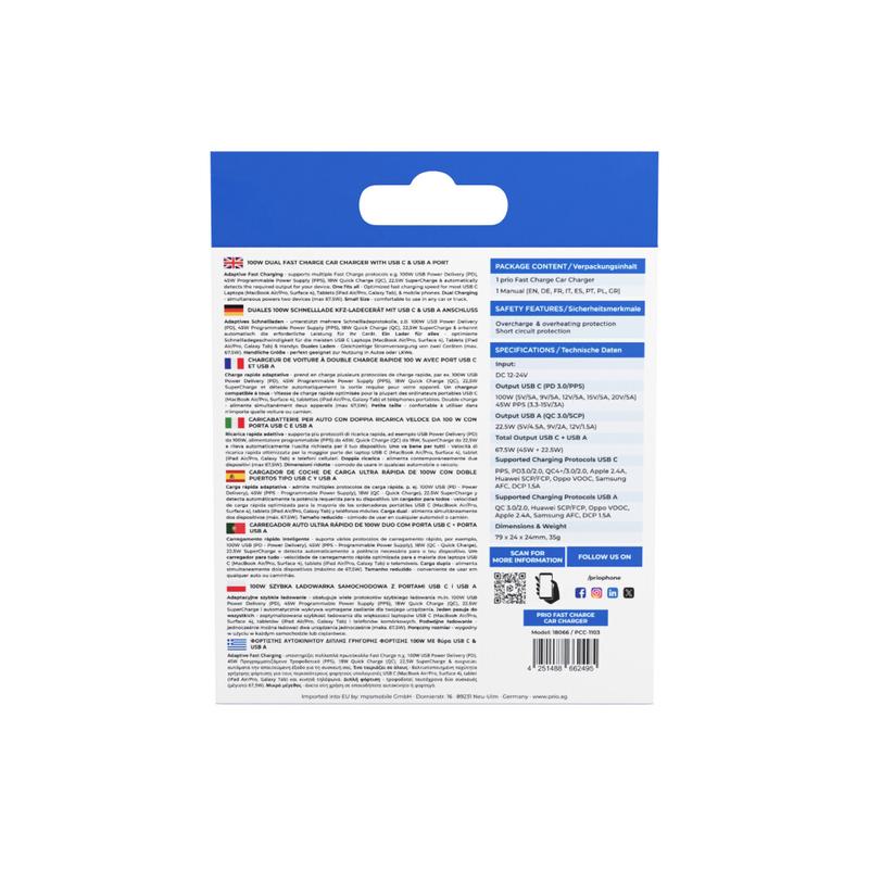 Prio Fast Charge biloplader med 100 W PD USB-C, 22,5 W USB-A