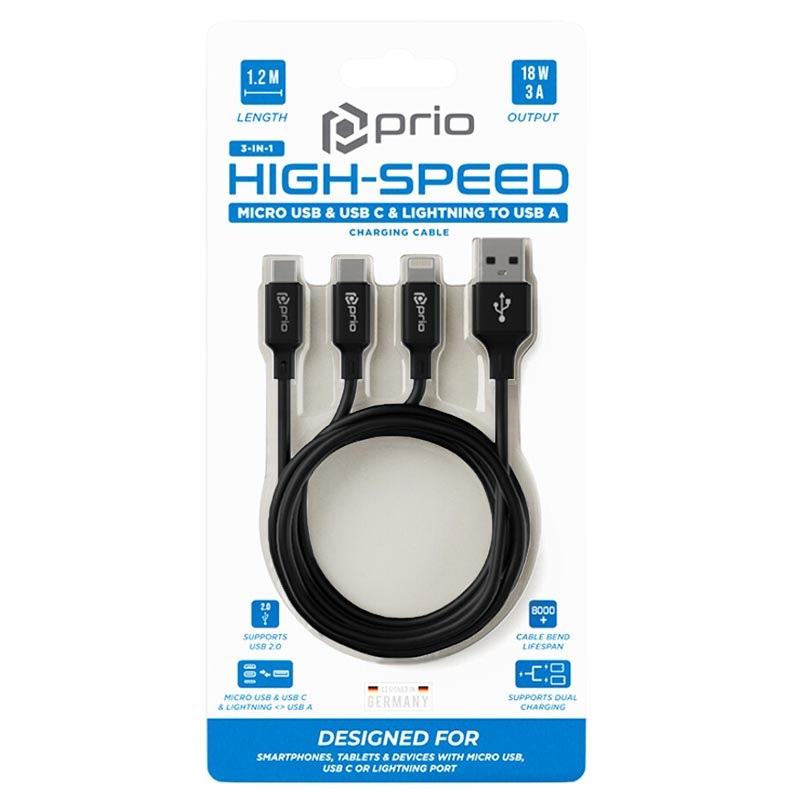 Prio High-Speed 3-i-1 Ladekabel - Lightning, USB-C, MicroUSB, 3A, 18W