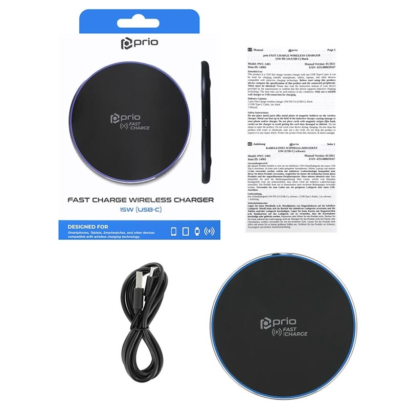 Prio Universal Hurtig Trådløs Oplader - 15W, USB-C