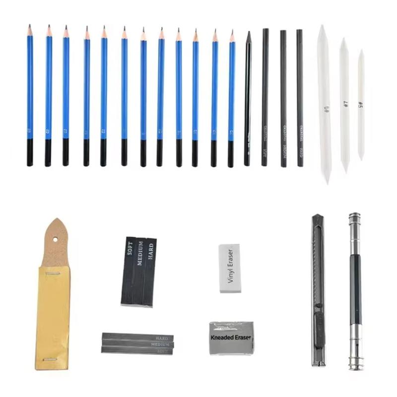 - Komplet kunstnerisk sortiment - Indeholder en række grafitblyanter, kulstifter, blandingsværktøjer og meget mere til forskellige kunstneriske teknikker.