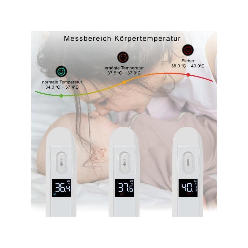 Dette pandetermometer er uundværligt for forældre og plejepersonale, der ønsker en pålidelig og hygiejnisk måde at overvåge kropstemperaturen på. Med sin kontaktløse betjening, hurtige resultater og brugervenlige design giver det ro i sindet, uanset om du er hjemme eller på farten. Den 3-farvede feberindikator og lydløse tilstand gør den særlig nyttig til overvågning om natten uden at forstyrre søvnen.