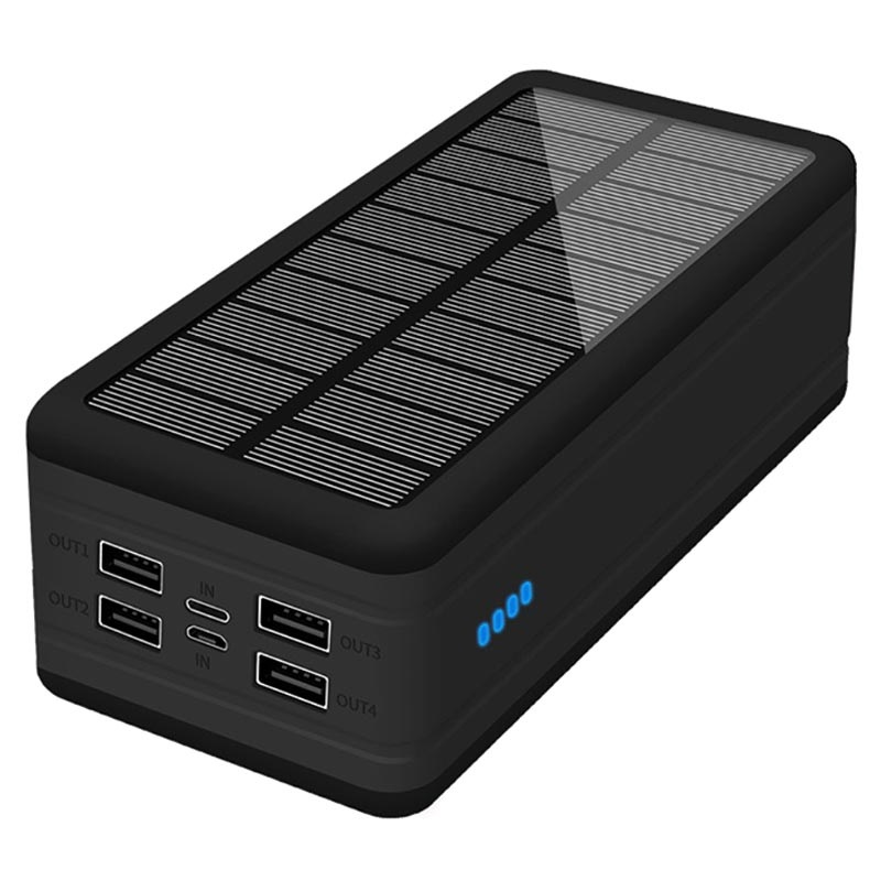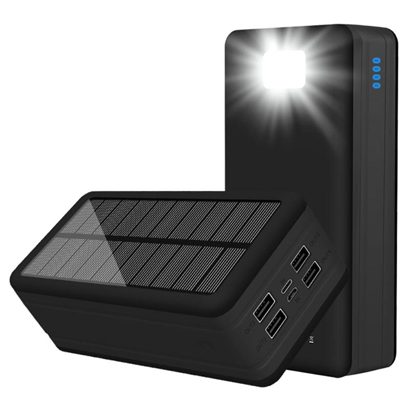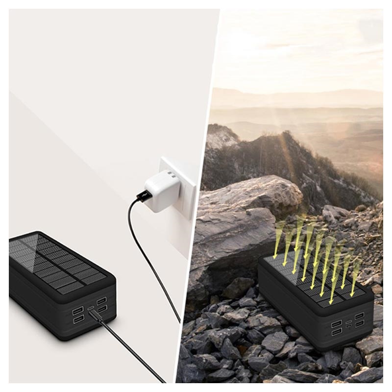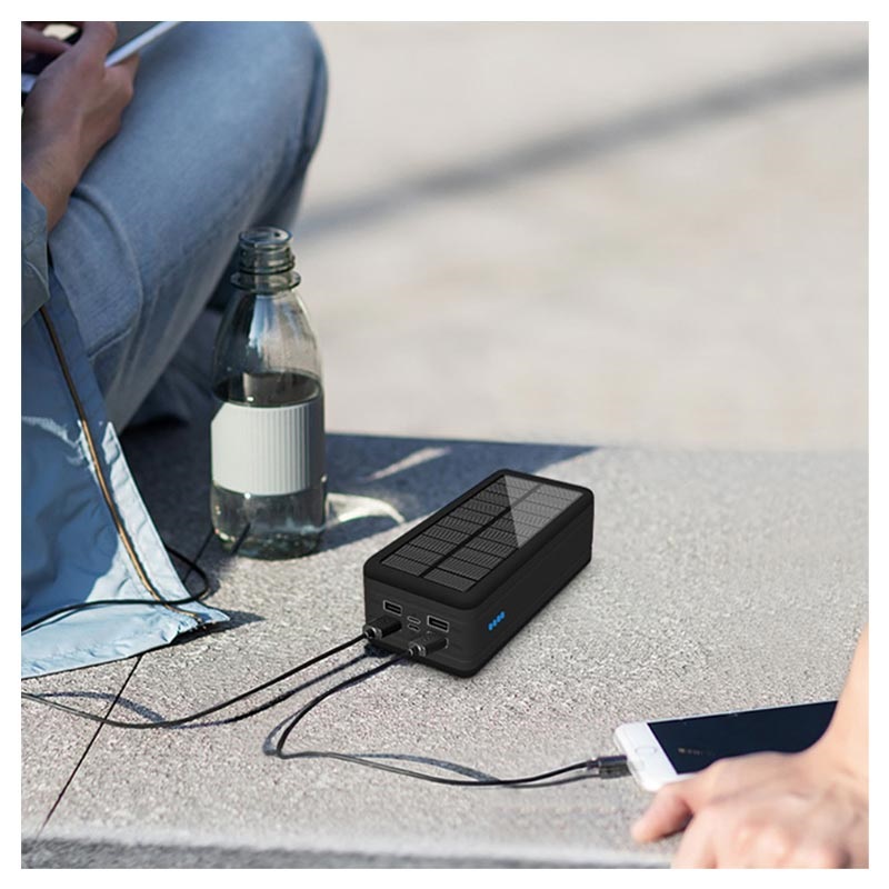 powerbank, som er en nødvendig følgesvend på rejser, camping og udflugter. Den er udstyret med et monokrystallinsk silicium solpanel, MicroUSB og USB Type-C indgange, samt fire USB-A porte til samtidig opladning af flere enheder. De indbyggede, smarte chips registrerer automatisk den forbundne enhed og leverer den optimale strøm, for at sikre en effektiv opladning der ikke skader enheden.