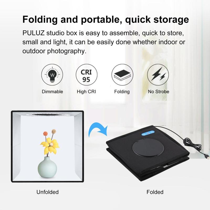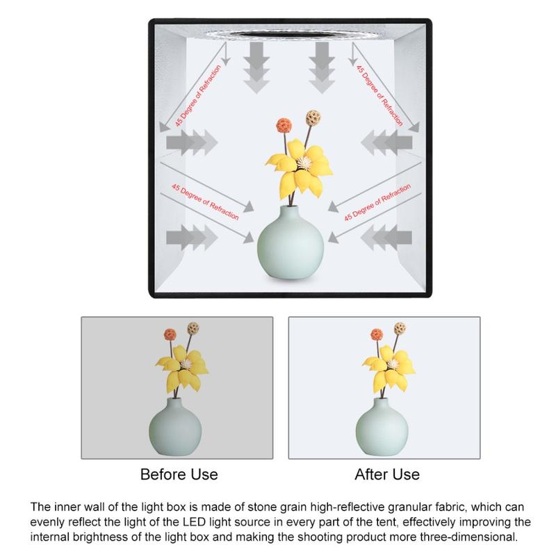 Den er nem at samle (tager kun tre sekunder at samle og bruge), og du kan folde denne LED-lyskasse ud og placere den på en hvilken som helst overflade for at få en god baggrund til kommerciel fotografering af små genstande og tage billeder af produktet.