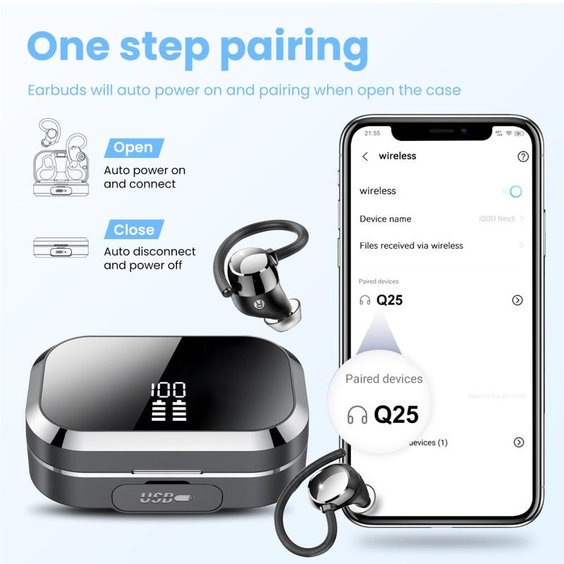 Q25 er et fremragende valg for brugere, der ønsker praktiske øretelefoner til hverdagsbrug med en mere sikker pasform og ekstra funktionalitet. I stedet for kun at tilbyde grundlæggende trådløs afspilning tilføjer den nyttige funktioner såsom et powerbank-opladningsetui, LED-batteridisplay og flere lydtilstande, hvilket gør den særligt praktisk for folk med aktive rutiner eller lange dage væk fra en oplader.