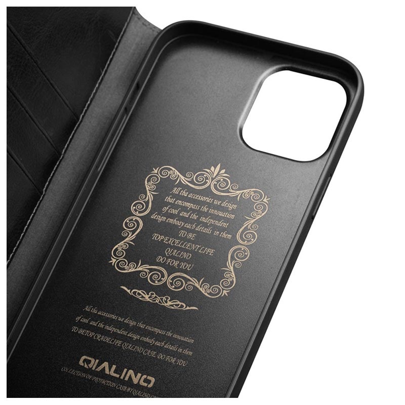 Beskyt din iPhone 12, iPhone 12 Pro i en elegant og moderne Qialino classic pung læder taske. Opbevar dine kreditkort, kontanter sammen med din mobil, takket være de integrerede lommer.