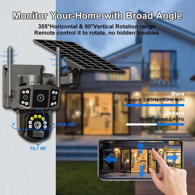 Sikre udendørsområder med bred dækning og færre blinde vinkler ved hjælp af QL18 solcelledrevet sikkerhedskamera med dobbeltlinse. Det er designet til nem trådløs opsætning på 2,4 GHz WiFi og kombinerer to linser med PTZ-styring, så du kan overvåge vigtige områder og fjernjustere visningen, når der registreres aktivitet. 2K-opløsningen (2560x1440) giver skarpere detaljer for indgange, gårde, frugtplantager og arbejdspladser, mens H.265-komprimering hjælper med at spare lagerplads uden at gå på kompromis med klarheden.