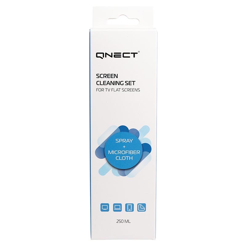 Qnect Skærm Rengøringssæt til Smartphone, Tablet, TV - 250ml Desinfektionsspray & Mikrofiberklud