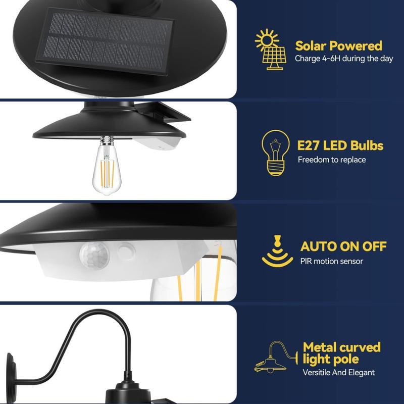 Retro solcellelampe med Edison-stil LED og bevægelsessensor - 3-Mode IP65 udendørs væglampe