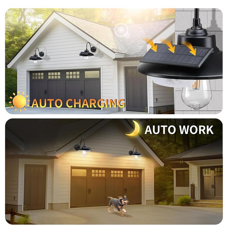Giv skure, stalde, terrasser eller indgangspartier en varm bondegårdsglød og spar samtidig på energiomkostningerne. Denne solcelledrevne staldlampe kombinerer en klassisk buet skærm med en LED-pære i Edison-stil og bevægelsesaktiveret lysstyrke, hvilket giver både stemning og sikkerhed i et pænt armatur.