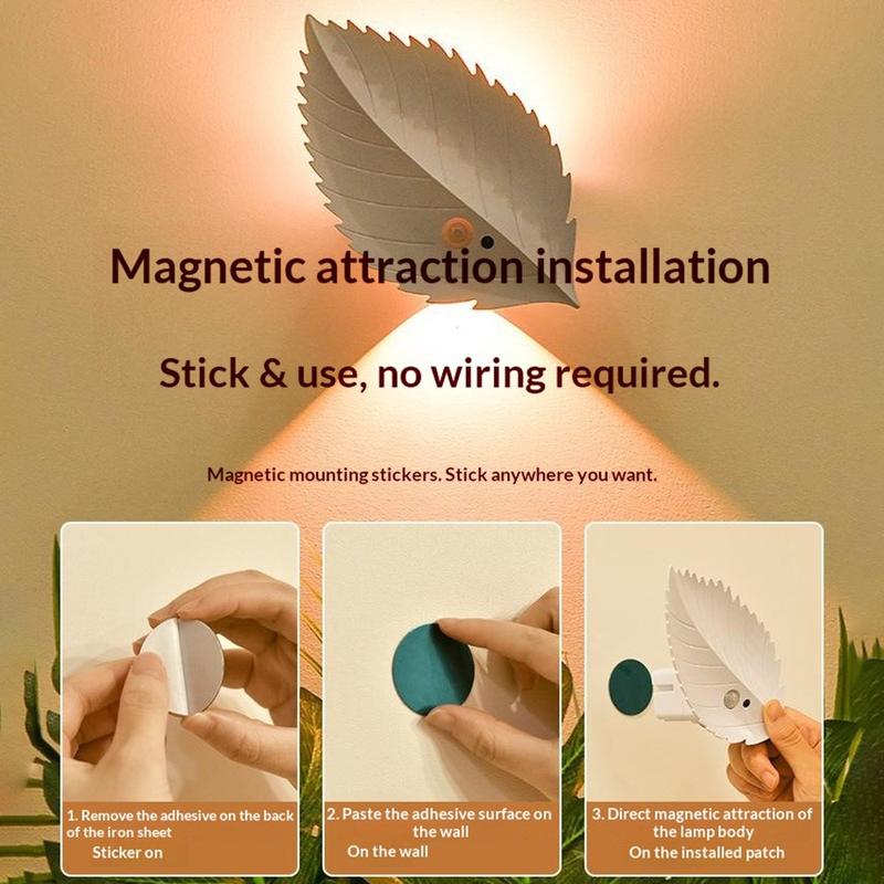 Tilføj en varm, hyggelig glød til ethvert rum med dette bladformede RGBW-nattelys, der er designet til at se dekorativt ud og samtidig give dig praktisk belysning, når du har brug for det. Det kombinerer bevægelsessensor med fjernbetjening, så det kan tændes automatisk, når du går forbi, eller justeres fra sengen, sofaen eller skrivebordet. Med trinløs dæmpning og 10 farveindstillinger kan du skifte fra et blidt nattelys til stemningsbelysning til afslappende aftener, børneværelser eller vejledning i gangen.