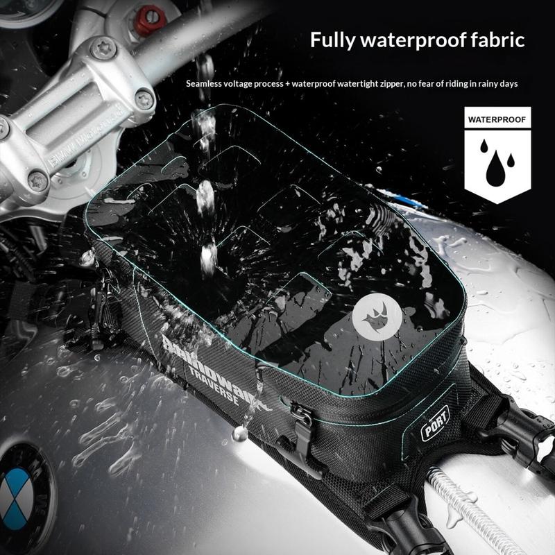 Tasken har et fuldt vandtæt design med vandtæt stof, forseglet konstruktion og vandtætte lynlåse, der hjælper med at beskytte dine ejendele under regnfulde ture. Den konturerede struktur og det professionelle monteringssystem sikrer en stabil pasform på tanken, hvilket minimerer bevægelse selv på ujævne veje. Med integrerede refleksstrimler forbedrer den også motorcyklistens synlighed i dårlige lysforhold for øget sikkerhed.