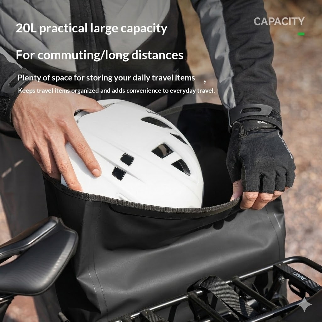 Med ROCKBROS AS-166 bagagebæretaske kan du transportere dine vigtigste ting mere komfortabelt på hver eneste tur. Denne alsidige 20-liters cykeltaske er designet til pendling, cykelture og daglig cykling og kombinerer praktisk opbevaringsplads med pålidelig vejrbeskyttelse. Takket være rulle-lukningen kan du tilpasse tasken efter din bagage, hvilket gør den lige så anvendelig til daglige ærinder som til længere weekendture.