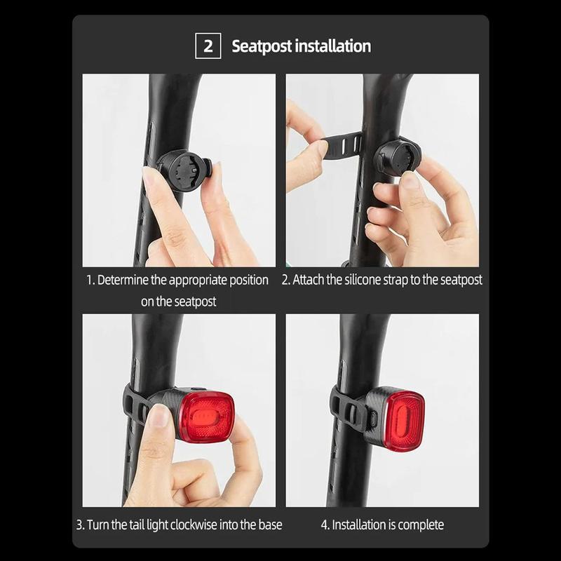 Du kan vælge mellem 4 lystilstande: (1) Slow Red Flash: det røde lys lyser i 3 sekunder, når du bremser om dagen, flash+bremselys+intelligent 30s on-off om natten. (2) Breathing Flash Mode: det røde lys lyser i 3 sekunder, når du bremser om dagen, flash+bremselys+intelligent 30s on-off om natten. (3) Fast Flash Mode: blink + bremselys tændt dag og nat. (4) Steady On Mode: blink + bremselys dag og nat. COB-lysperler gør dig mere synlig, hvilket er mere lyst om natten