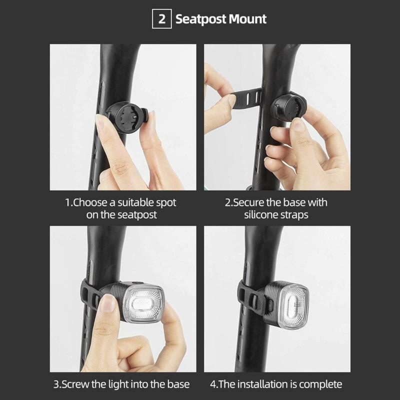 Cyklens baglygte har fem tilstande at skifte mellem: 1. Rødt langsomt blink 2. Rødt stroboskopblink 3. Breathe Flash 4. Rød/Blå/Lilla Switching Strobe Flash 5. Rød konstant tændt. Fem tilstande til dit valg, forbedrer sikkerheden ved ridning, mens du også forbedrer det sjove, hvilket gør dig anderledes i mængden