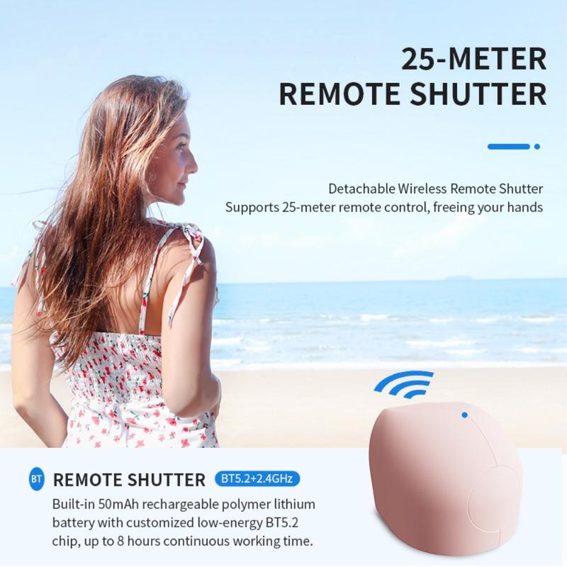 - Aftagelig trådløs fjernudløser: Styr nemt dine optagelser med den aftagelige fjernlukker, der understøtter en rækkevidde på op til 25 meter, ideelt til gruppebilleder, vlogging og håndfri optagelser.