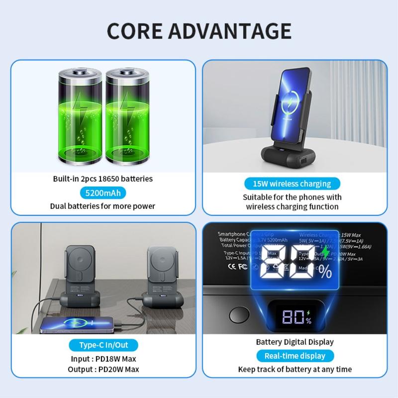 - 15W trådløs opladning: Understøtter 15W trådløs opladning for at holde din telefon opladet, mens du fotograferer. Kompatibel med alle smartphones, der understøtter trådløs opladning.