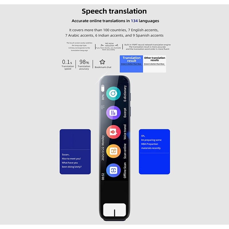 Fotooversættelse bruger OCR-teknologi (optisk tegngenkendelse) til at scanne og øjeblikkeligt oversætte tekst fra billeder, hvilket gør det særligt nyttigt at læse skilte, menuer eller dokumenter, når man er ude at rejse. Stemmeoversættelse på 134 sprog gør også S08B til en af de mest alsidige håndholdte oversættere på markedet.