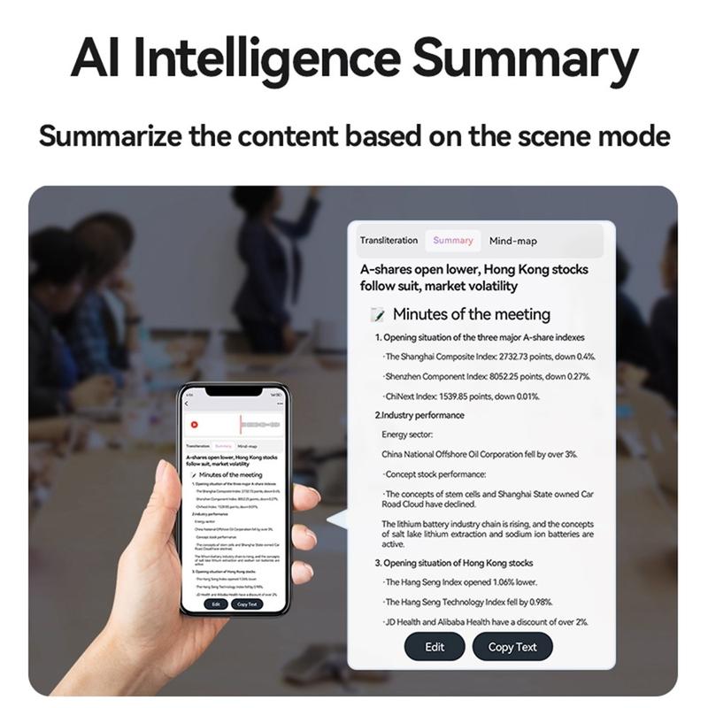 - AI-drevet transskription: Opret forbindelse til AIREC-APP'en via Bluetooth 5.3 for at få transskription og oversættelse i realtid på 188 sprog, drevet af ChatGPT.
