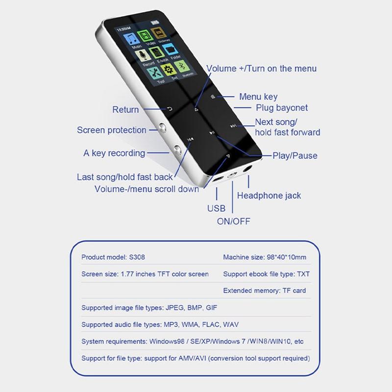 S308 MP3- og MP4-musikafspiller med Bluetooth, lydoptager og ordbog - High-Fidelity-musik og smart læring