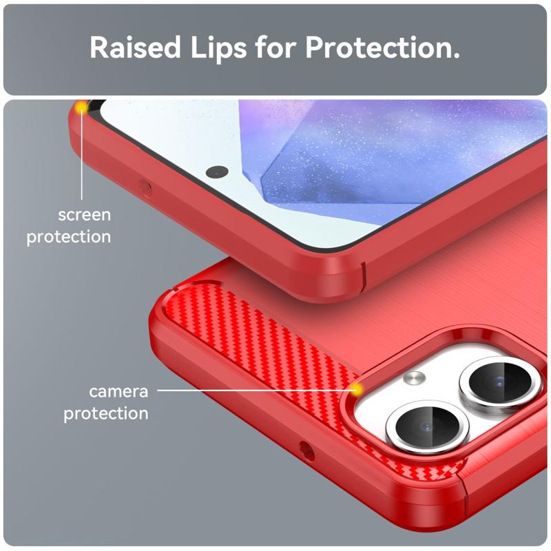 Det børstede TPU-cover beskytter din Samsung Galaxy A06 tilstrækkeligt, mens det giver den en fantastisk stil, takket være dets kulfibermønster på bagsiden. Coveret sikrer også mod overophedning, når du bruger din Samsung Galaxy A06, med dets varmeafledningsdesign.
