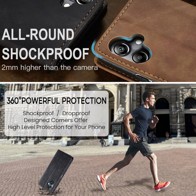 En kombination af TPU og polyurethan giver all-round beskyttelse til Samsung Galaxy A06, der beskytter den mod støv, snavs, stød, ridser og dagligt slid. Magneter holder coveret lukket, og et smart design muliggør håndfri brug, mens du ser medieindhold.