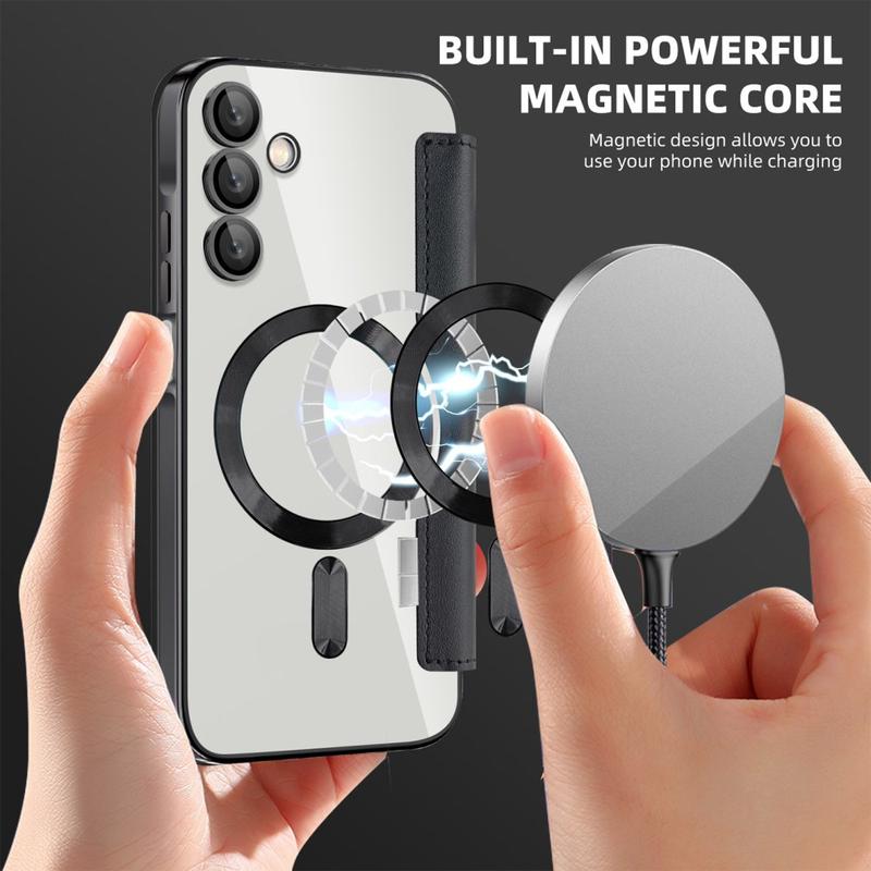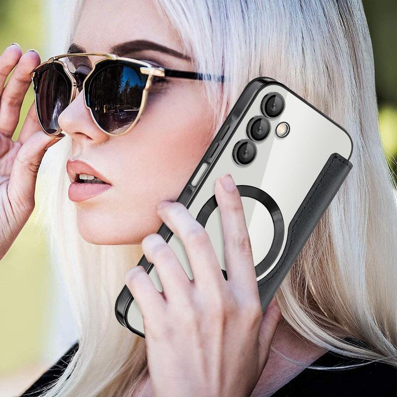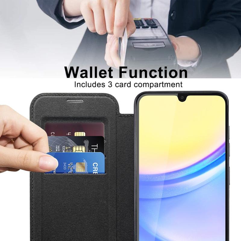 Dette førsteklasses Samsung Galaxy A15-etui er fremstillet af TPU, akryl og polyuretan i høj kvalitet ved hjælp af en fin proces for at sikre en delikat og udsøgt finish. Det er udstyret med en praktisk kortlomme, så du nemt kan trække kort og bruge dem på farten, og det har en stærk magnet til automatisk lukning, hvilket gør det sikkert og nemt at håndtere ting indeni. Dette Samsung Galaxy A15-etui giver effektiv beskyttelse mod daglig slitage, ridser, mærker og skrammer, mens den avancerede RFID-blokeringsteknologi i kortlommen sikrer, at dine personlige oplysninger er beskyttet mod tyveri. Derudover er den indbyggede magnetring kompatibel med MagSafe trådløs opladning, hvilket betyder, at du kan oplade din Samsung Galaxy A15 uden at tage etuiet af.