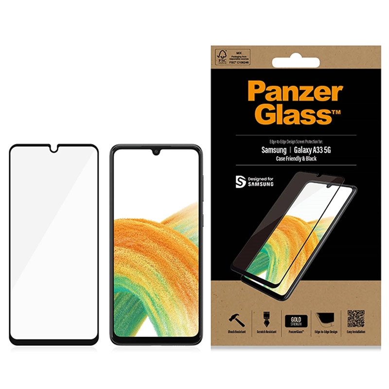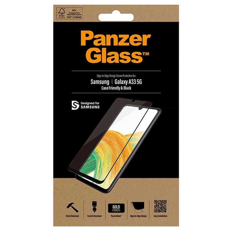 Samsung Galaxy A33 5G PanzerGlass Case Friendly Skærmbeskyttelse med sort kant er den ultimative løsning til at beskytte din smartphone. Denne skærmbeskyttelse er designet til at passe perfekt med etuier, hvilket sikrer, at din enhed forbliver beskyttet uden at gå på kompromis med funktionaliteten. Med sin sorte kant tilføjer den et stilfuldt touch til din telefon, samtidig med at den giver maksimal beskyttelse mod ridser, stød og fald.