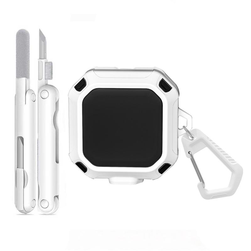 Etuiet leveres med en praktisk metal-karabinhage, så du kan fastgøre dine øretelefoner sikkert til en rygsæk, bæltestrop eller nøglering, så de altid er inden for rækkevidde. Der medfølger også en multifunktionel rengøringspen, der hjælper med at fjerne støv, snavs og rester fra øretelefonerne og opladningskontakterne, så din enhed forbliver ren og fungerer korrekt. Med præcise udskæringer og fuld kompatibilitet med trådløs opladning kan du oplade dine øretelefoner uden at fjerne etuiet.
